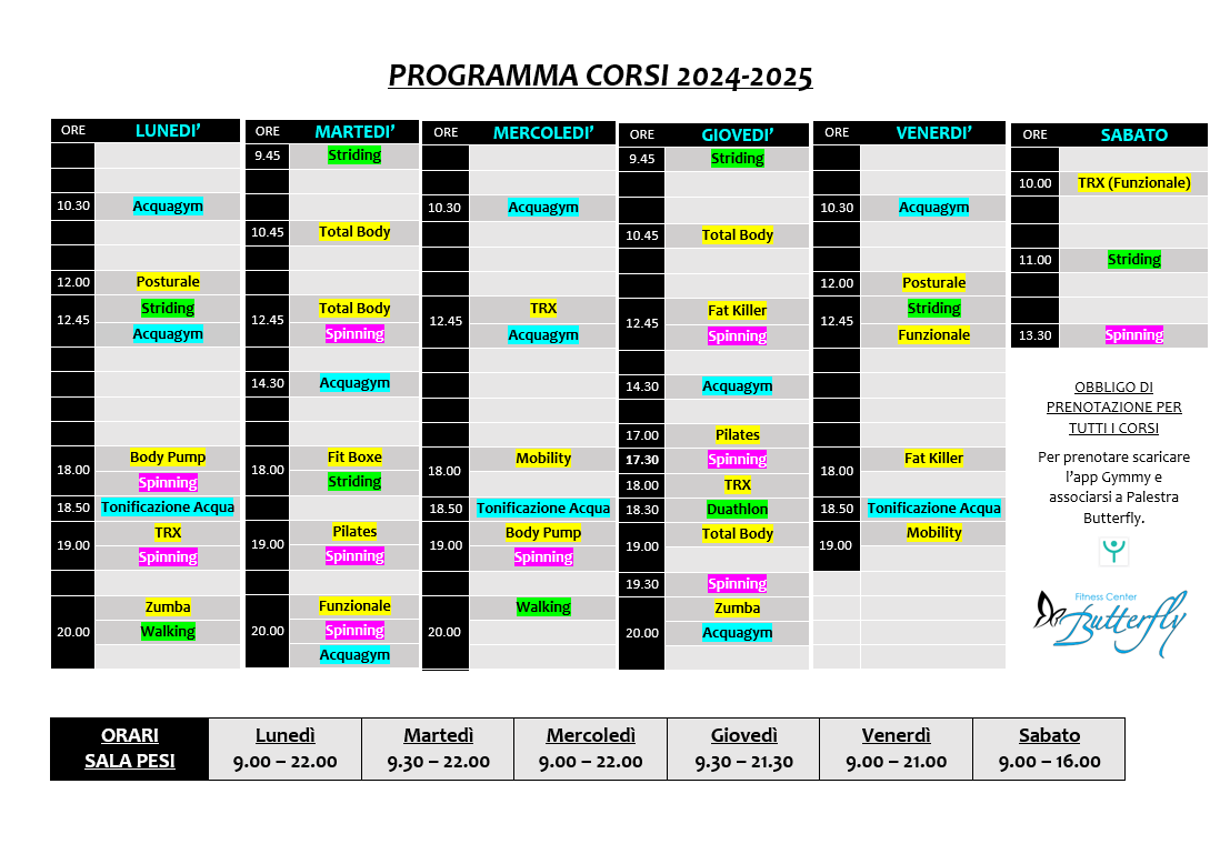 Il sito e' in fase di lavorazione. Per ogni informazione in tempo reale su corsi, orari e promozioni seguiteci sui SOCIAL (Facebook e Instagram). Per le prenotazioni scarica l'app GYMMY e associati. Cerca PALESTRA BUTTERFLY sui social e sull'app e resta in contatto con noi :)